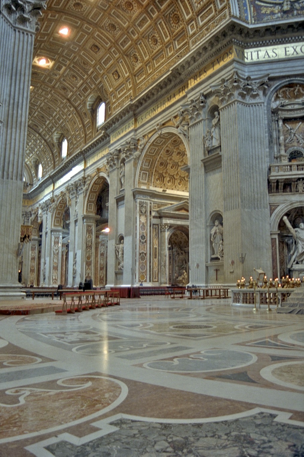 Andspænis okkur gnæfir sviplítil framhlið kirkjunnar, hönnuð af Carlo Maderno og reist 1607-1614. Styttur Péturs og Páls postula standa á tröppunum framan við kirkjuna.
