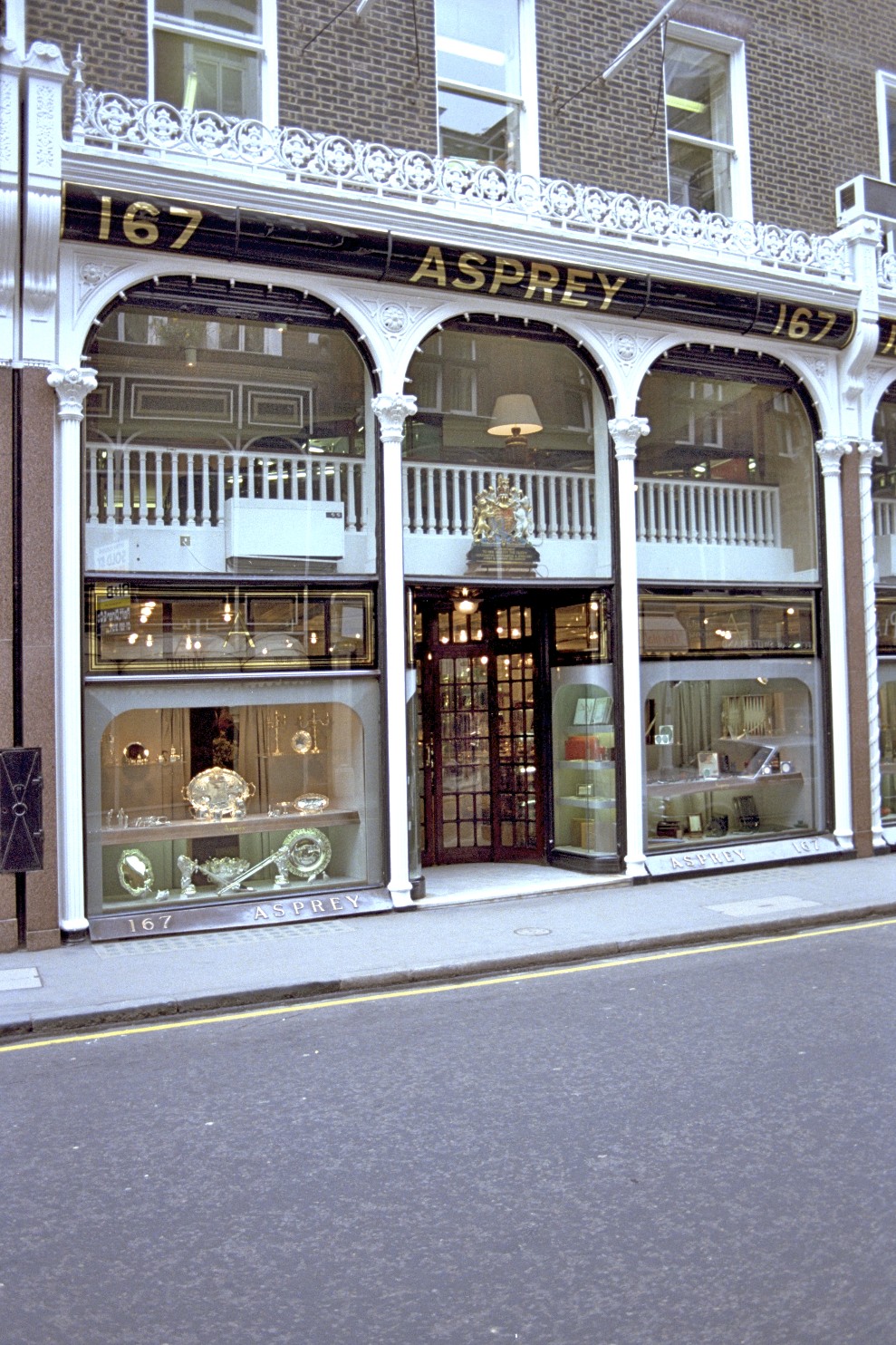 Nú skiptir gatan um nafn og heitir hér eftir New Bond Street. Hinum megin hennar komum við brátt, á nr. 167, að Asprey, einum þekktasta gullsmið borgarinnar, með mörgum vænum gluggum út að götu. Og auðvitað er hann konunglegur hirðgullsmiður.