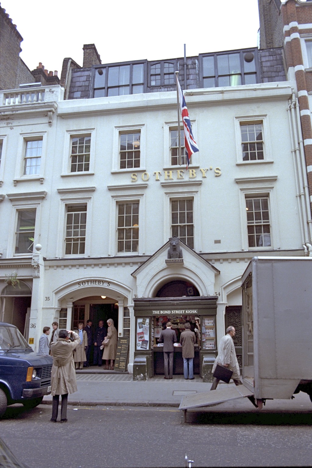 Hér aðeins ofar, hægra megin götunnar, á nr. 35, er Sotheby´s, annar af tveimur heimsfrægum uppboðshöldurum borgarinnar. Þessi er raunar eldri og stærri, heldur yfir 500 uppboð á ári og hélt uppboð á geirfuglinum og Flateyjarbók. Munirnir eru til sýnis í eina viku fyrir uppboð og sýningarskrár eru til mánuði fyrir þau. Mánudaga eru boðnar upp bækur, smávörur og gler, þriðjudaga bækur og postulín, miðvikudaga málverk, fimmtudaga silfur og skartgripir, föstudaga húsgögn og listmunir.