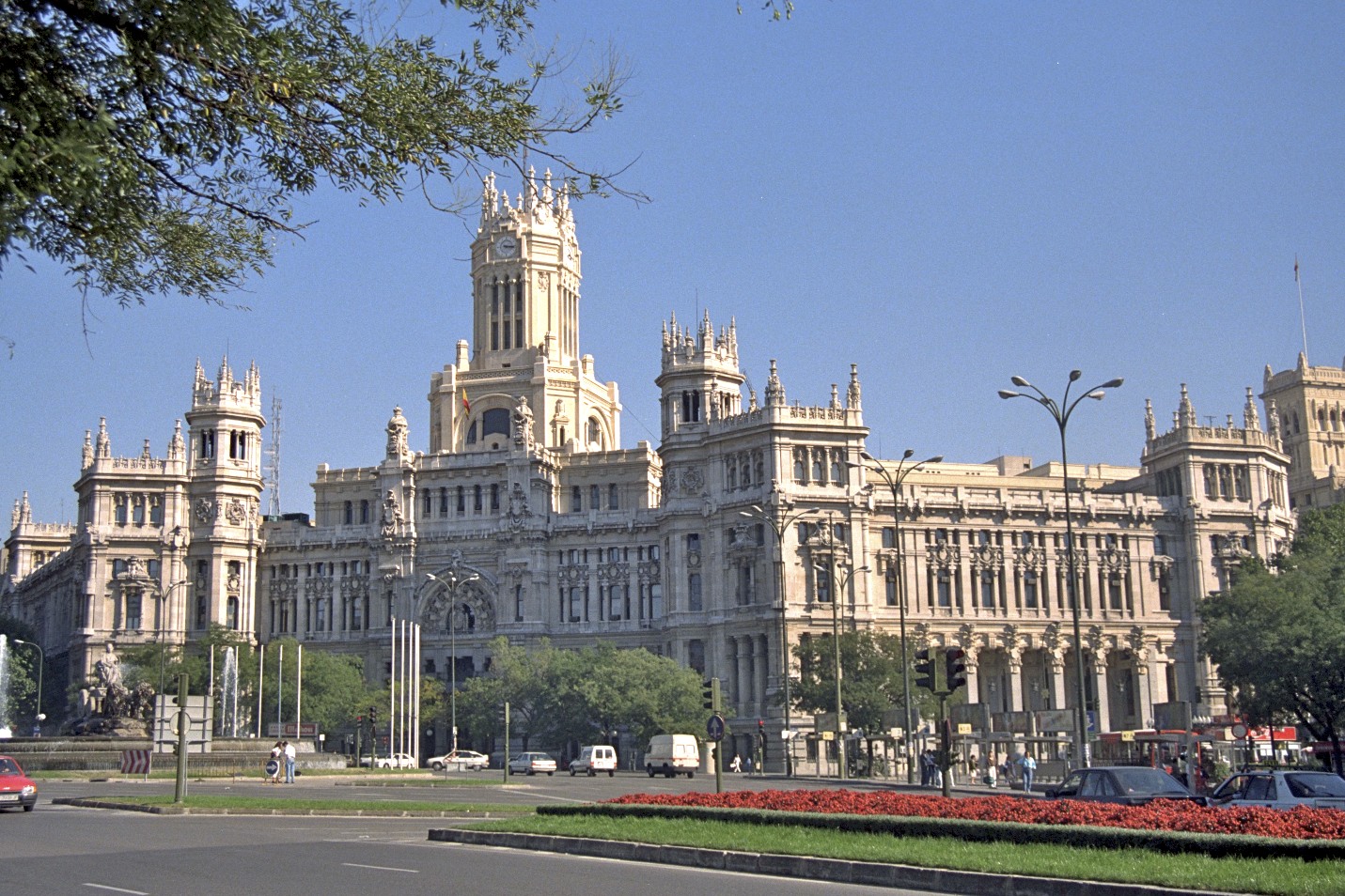Við staðnæmust á næsta torgi, Plaza de Cibeles, og virðum fyrir okkur pósthúsið handan götunnar. Sennilega er þetta virðulegasta pósthús veraldar, enn skrautlegra en gamla pósthúsið í Amsterdam, reist í brúðkaupstertustíl upp úr síðustu aldamótum. Á torginu er átjándu aldar stytta af frjósemisgyðjunni Kýbelu í vagni, sem er dreginn af ljónum.