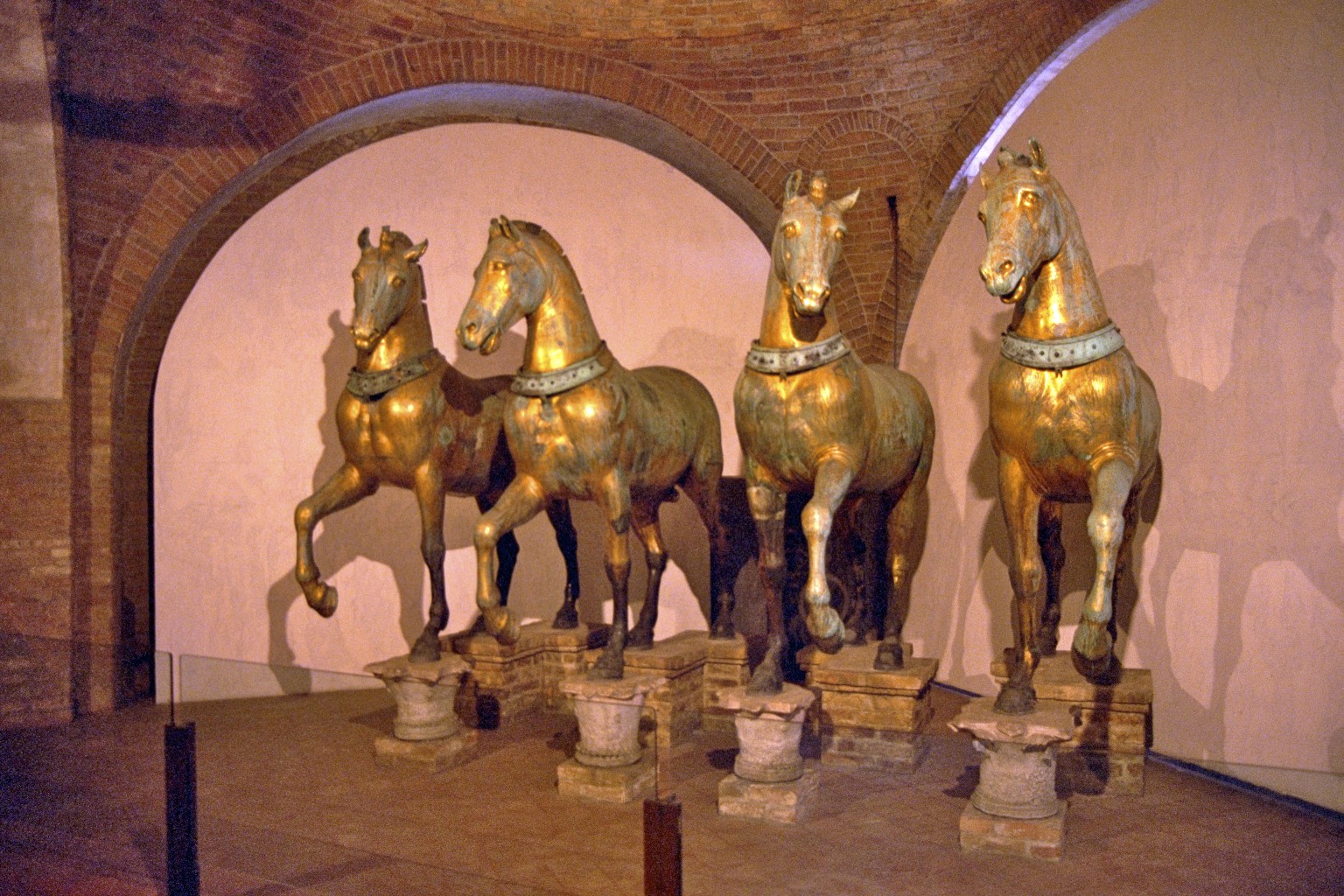 Í stofu að baki svalanna eru hinar upprunalegu hrossastyttur úr bronzi varðveittar úti í horni. Þær voru upphaflega við keisarastúku paðreimsins í Miklagarði. Margt hafa þær séð um dagana, en núna á elliárunum hafa þær ekkert útsýni.
