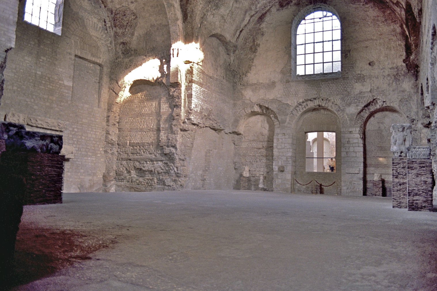 The remains of the Roman baths are considered to be about one third of the original structure from the beginning of the 3rd C. Best preserved is the cold bath, frigidarium, an open hall, 21 meters to 11 meters and with a height of 14,5 meters. The hot bath, caldarium, and the tepid bath, tepidarium, have for the most part been destroyed.