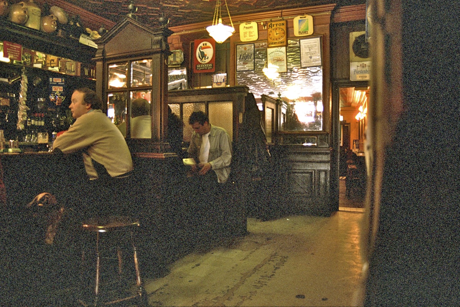 Þetta er afar dimm og afar lítil krá með ljótu dúkagólfi og rifnum auglýsingaspjöldum og speglaauglýsingum á veggjum, svo og stórum leirkerjum uppi undir lofti. Spegluð skilrúm eru við barinn og gera hann enn þrengslalegri.