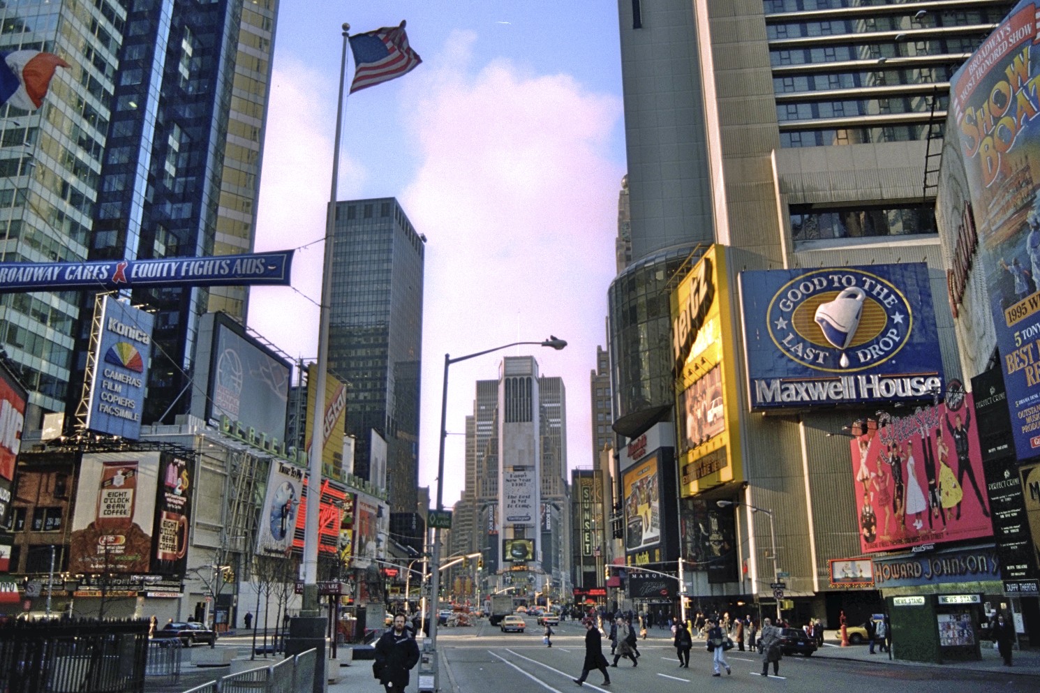Við fyrstu sýn er þetta fremur leiðinlegt hverfi neonljósa og klámstofnana, gleðikvenna og fíkniefnasala, sóðalegra kaffihúsa og lélegra veitingastofa. En dýrðin leynist rétt að baki, því að hér eru 42 leikhús á litlu svæði —mesta samþjöppun leikhúsa í heiminum — auk fjölmargra kvikmyndahúsa. Þetta hefur í heila öld verið miðstöð bandarískrar leiklistar.