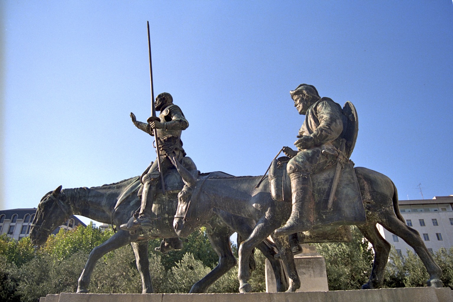 Við hefjum síðari gönguferðina á Spánartorgi, Plaza de España. Það er svo sem ekkert sérstaklega skemmtilegt torg, girt ljótum skýjakljúfum, en merkilegt fyrir bronzstyttuna af Don Quixote og Sancho Panza, sem er einkennistákn borgarinnar og ljósmyndað á kápu þessarar bókar. Yfir styttunni gnæfir minnismerki um rithöfundinn Miguel de Cervantes Saavedra, sem samdi söguna um þá félaga, hina dæmigerðu Kastilíubúa. Cervantes var uppi fyrir fjórum öldum, samtíðarmaður Shakespeares og sr Einars í Eydölum.